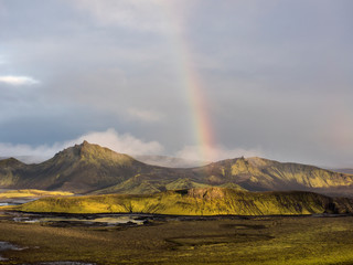 Moss covered black volcanic mountains near Langisjor Iceland and fog